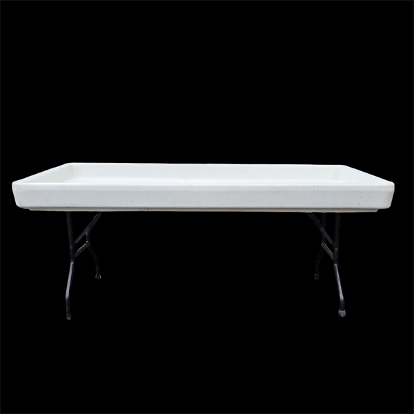 Table is 6' long with folding legs. Can stand on alone or be placed on top of another table. Great for buffet and drink service and holds around 75lbs of ice!