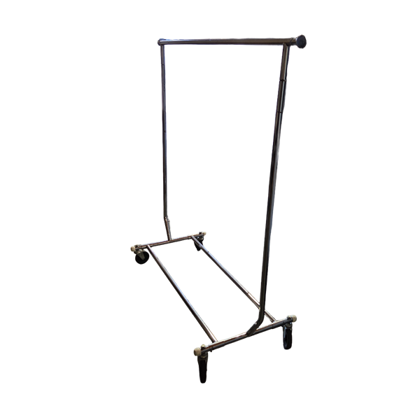 Collapsible garment racks on wheels. Units are 5' tall and 5' long with extensions for the height and lengths to go out an additional foot.