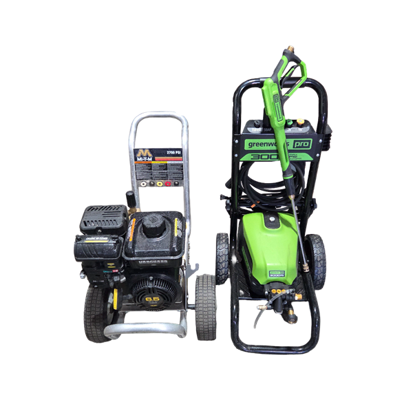 Gas or electric power washers. The gas unit is 2,700psi and the electric is 3,000 psi.