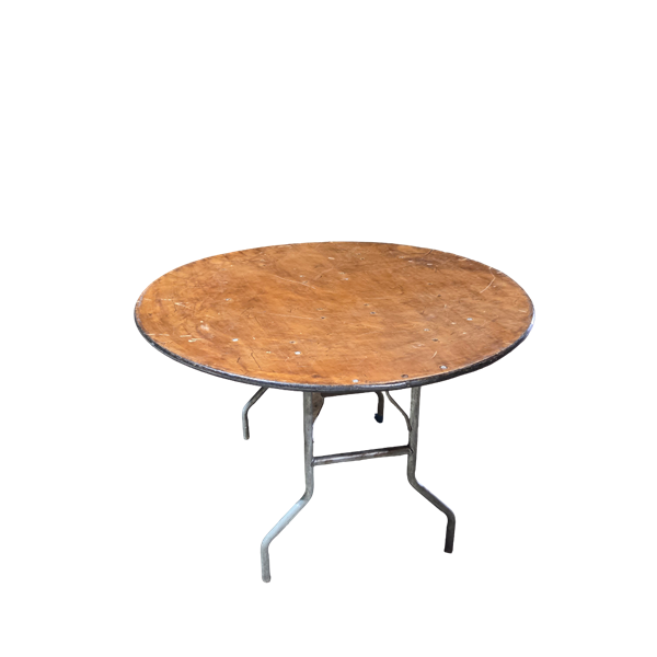 48" in diameter, the legs fold into the frame. Seats 4-6 people. Typically uses a 90" or a 102" linen.
